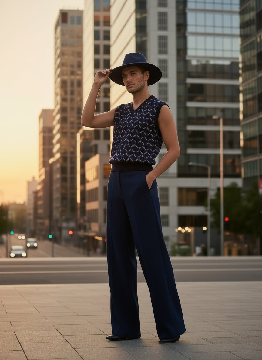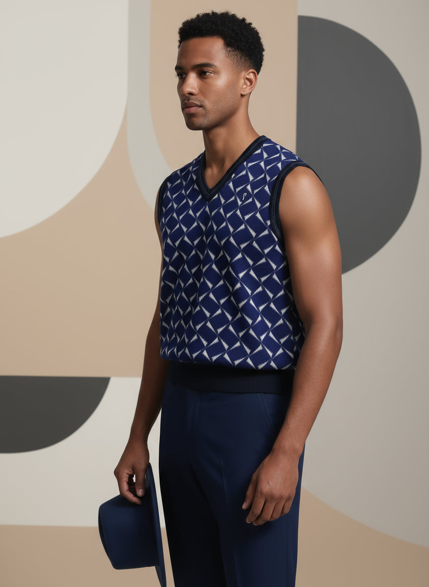 Dale un toque moderno y elegante a tu estilo con este chaleco tejido azul marino con diseño geométrico. Su patrón exclusivo combina tonos azules y blancos que aportan dinamismo y distinción, ideal para quienes buscan un look sofisticado sin perder frescura.